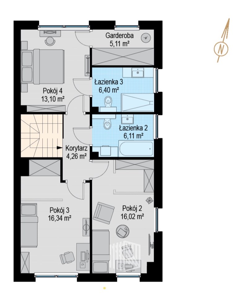 główna sypialnia – 13,10 m² + łazienka – 6,40 m² + garderoba – 5,11 m²