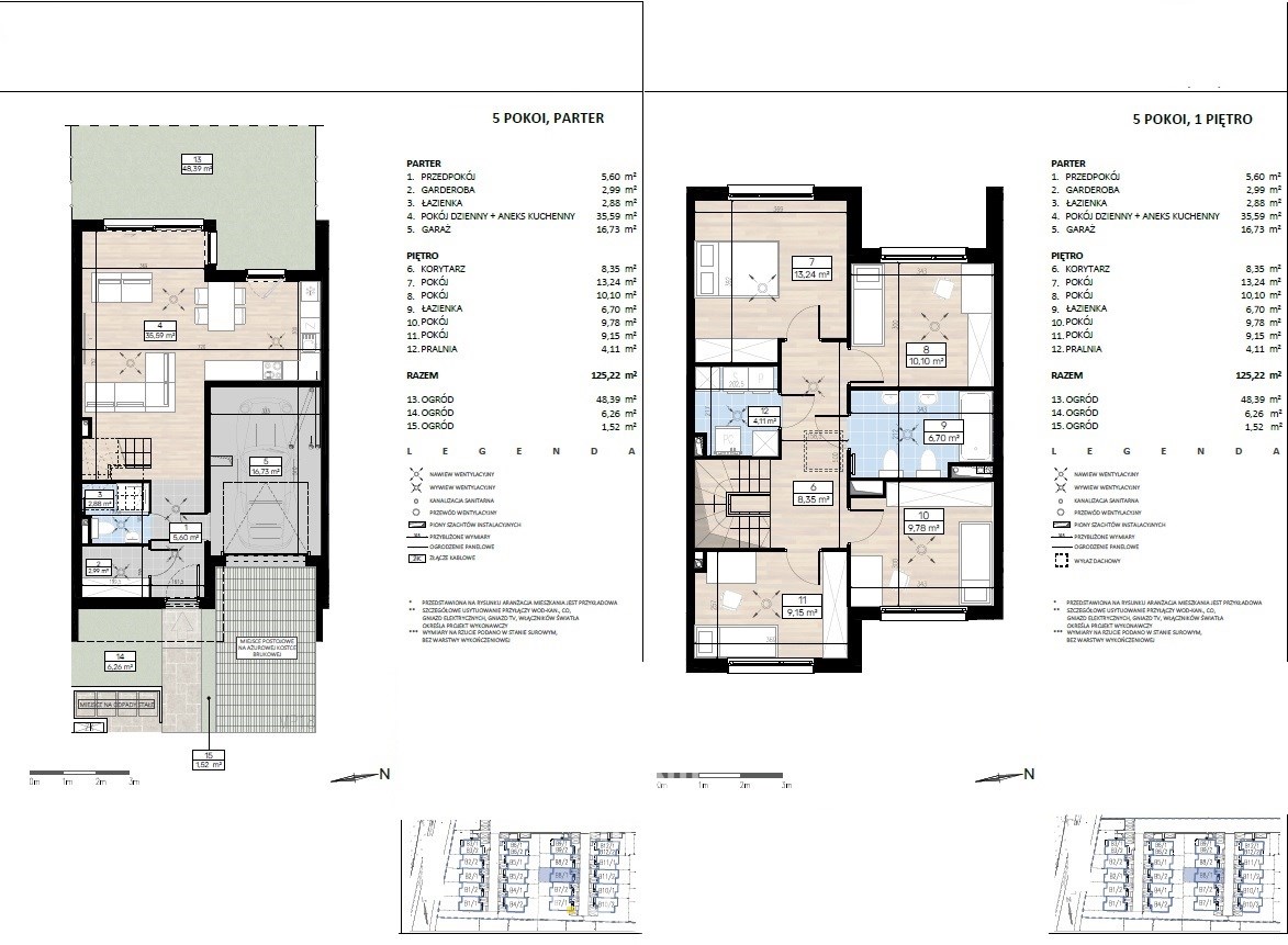 Domy budowane są z wysokiej klasy materiałów, wyposażone są w ogrzewanie podłogowe zasilane pompą ciepła marki Viessman, rolety elektryczne na parterze i piętrze, schody betonowe, garaż plus miejsce postojowe.