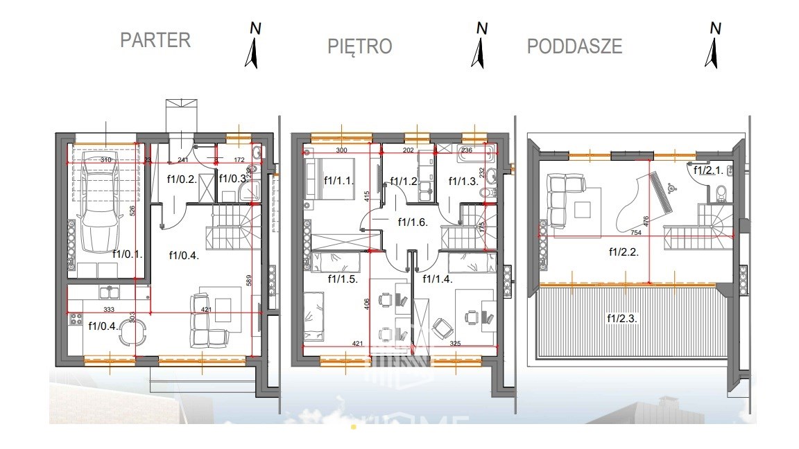 Parter to otwarta strefa dzienna z salonem i wyjściem na ogród, piętro – prywatna część sypialniana, a poddasze – przestrzeń do indywidualnej aranżacji.