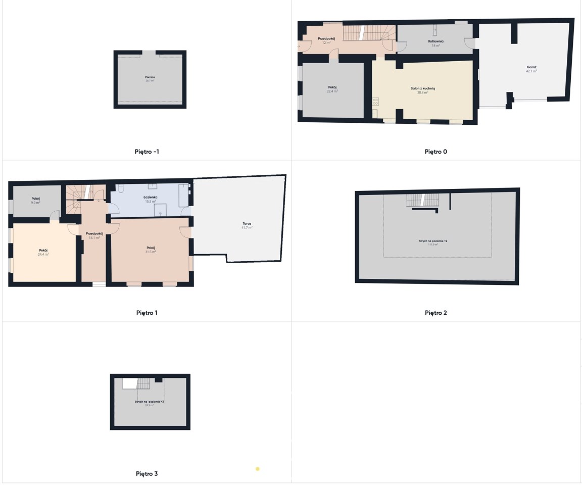 Piętro: trzy pokoje (9,9 m², 24,4 m² i 31,5 m²), przedpokój (14,1 m²), łazienka (15,5 m²), taras 41,7 m²