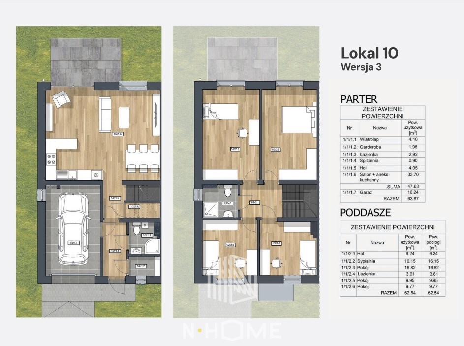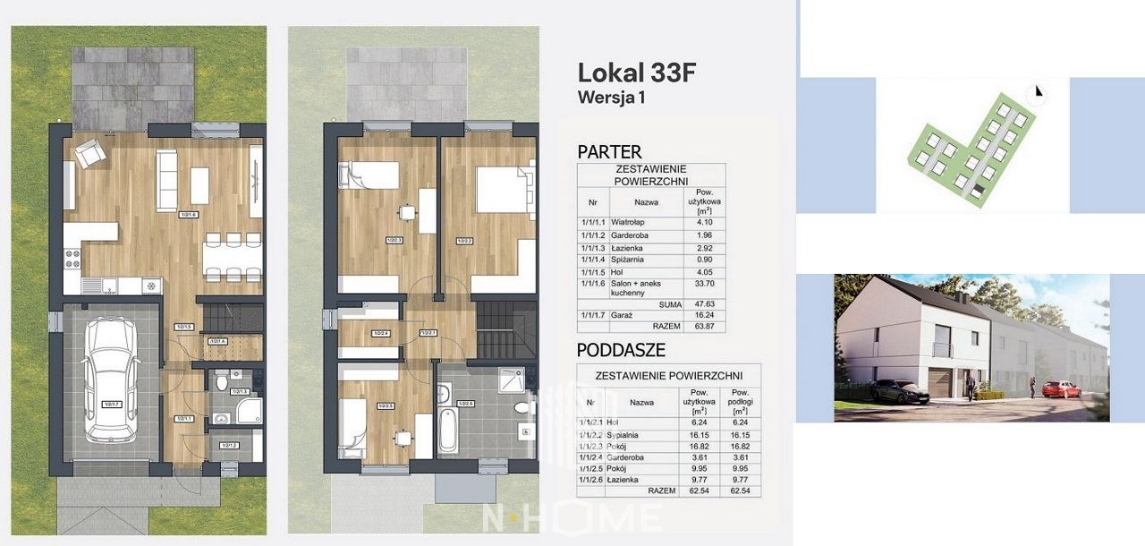 Garaż w bryle budynku oraz dodatkowe miejsce postojowe na podjeździe.