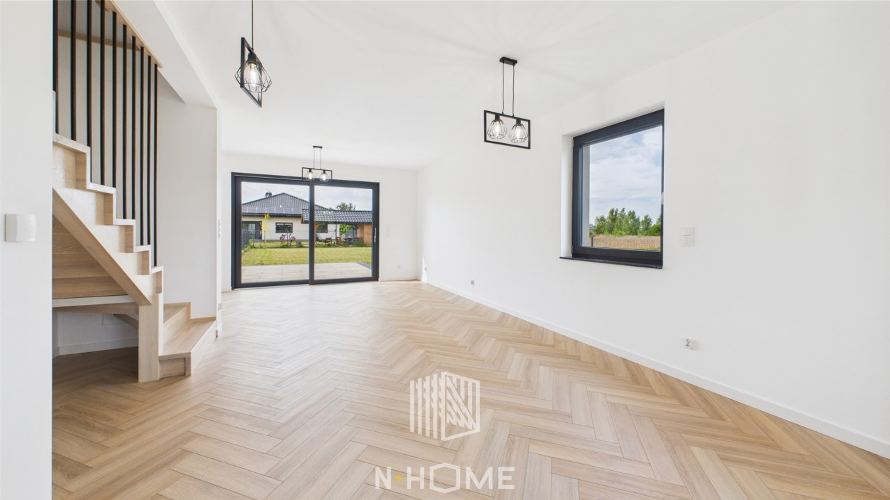 Nieruchomość wyposażona w pompę ciepła zapewniającą ogrzewanie dla lokalu (ogrzewanie podłogowe) oraz klimatyzację. Na terenie posesji betonowe szambo - 10 m3 z wyprowadzeniem rury do granicy działki. Budynek wybudowany z bloczków z porothermu, ocieplony styropianem, dachówka ceramiczna, okna PCV 3-szybowe oraz przesuwne okno w systemie HST prowadzące na taras. Zamontowane rolety zewnętrzne elektryczne oraz przygotowane podłączenie do kominka. Dojazd do nieruchomości utwardzoną drogą.