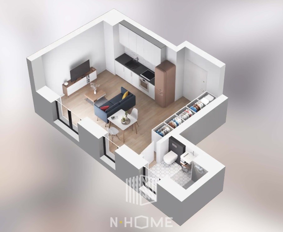 Przedstawiam funkcjonalną kawalerkę o powierzchni 25,71 m², położoną na 6. piętrze nowoczesnej inwestycji w ścisłym centrum Wrocławia. Projekt powstał w wyniku rewitalizacji terenów pofabrycznych, dzięki czemu łączy w sobie industrialny charakter, wysoki standard wykończenia oraz przemyślaną architekturę.