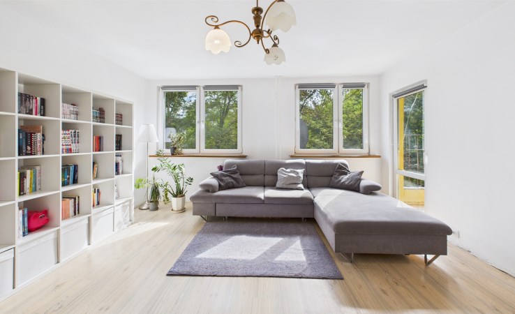 jasny salon z wyjściem na balkon,