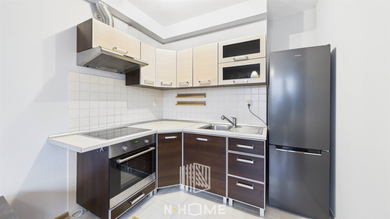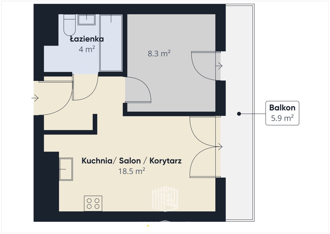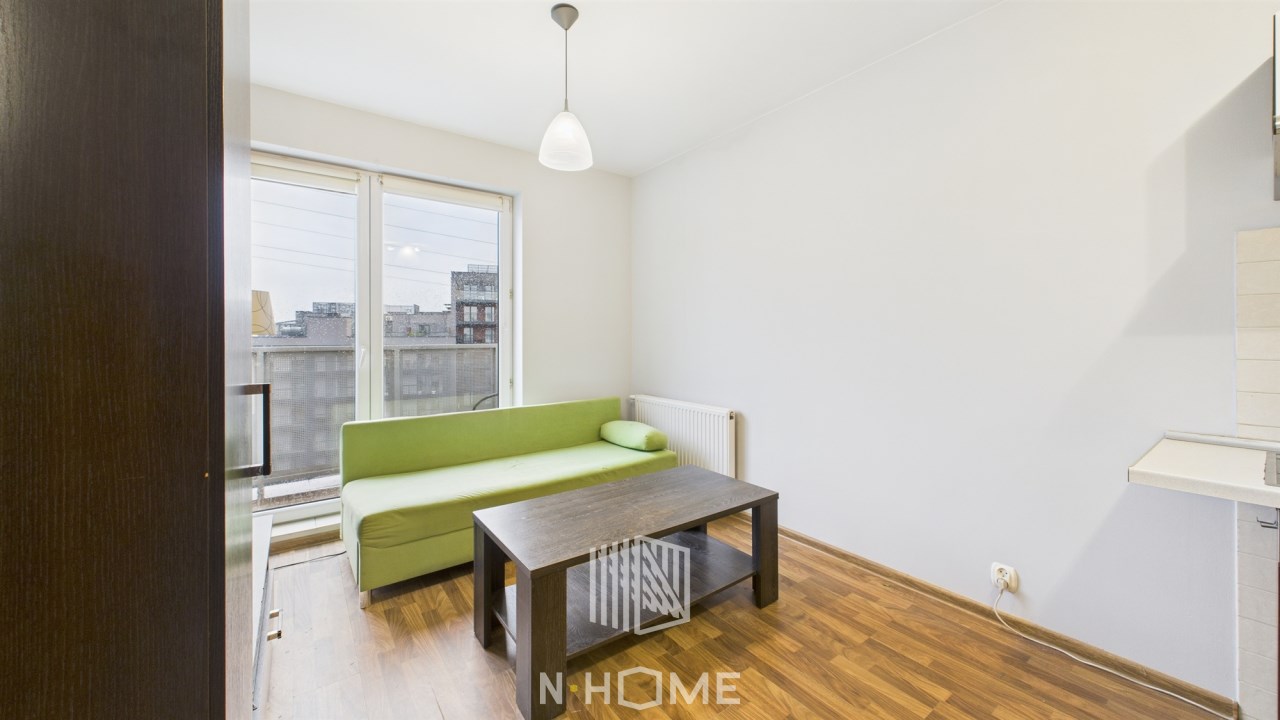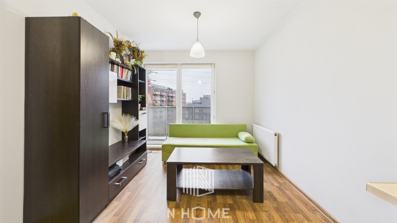 Salon z aneksem kuchennym (płyta indukcyjna, piekarnik, lodówka) i wyjściem na balkon