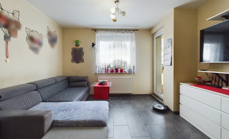 Przestronna, jasna strefa dzienna z miejscem na wygodną sofę, stół jadalniany i zabudowę kuchenną. Wyjście na loggię.