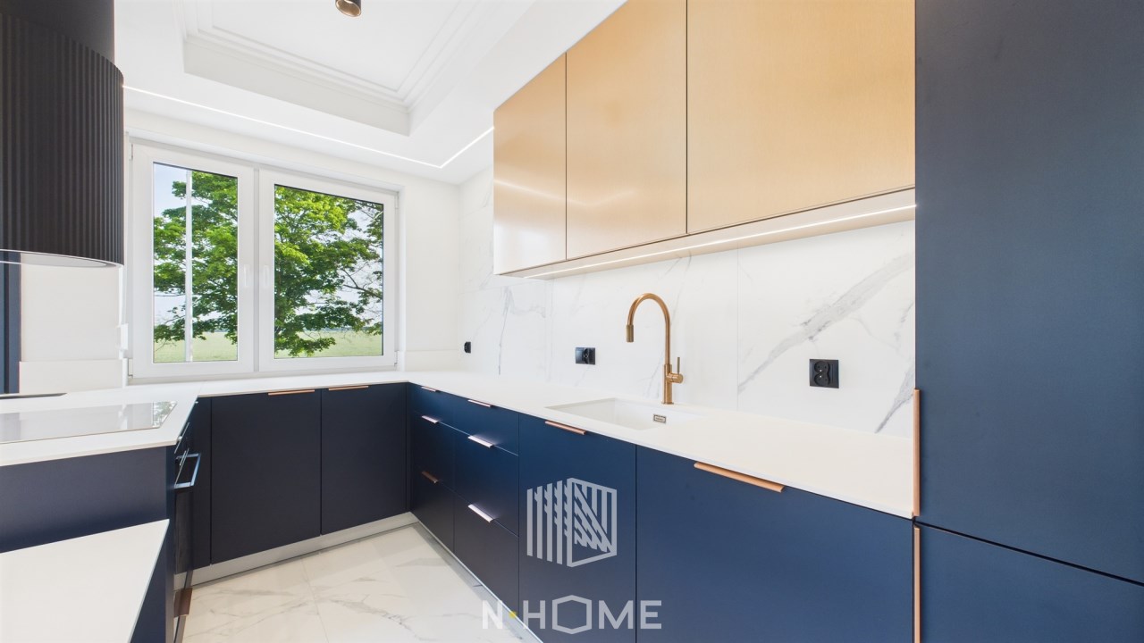 Nowoczesna zabudowa kuchni w granatowo-białej aranżacji. Wysokiej jakości sprzęt AGD.