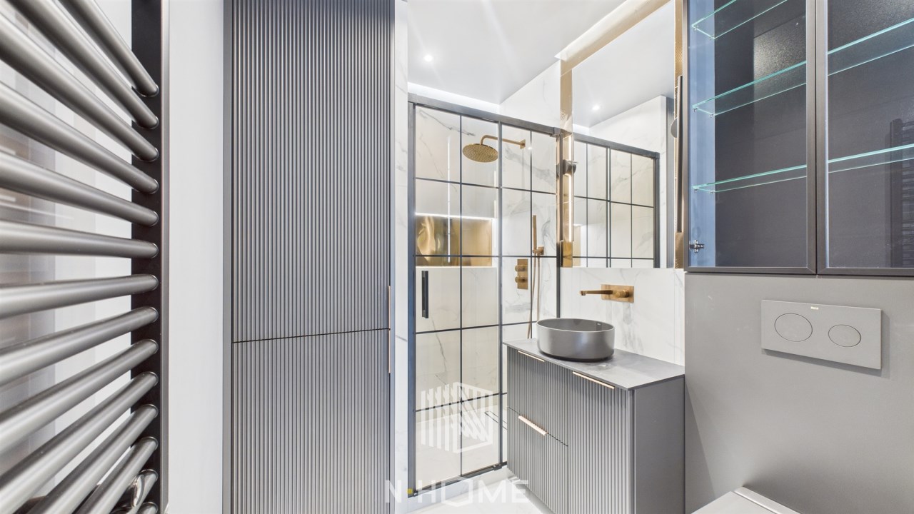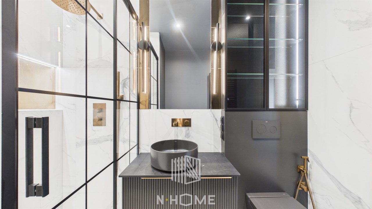 Wykończona białym marmurem i elegancką armaturą.