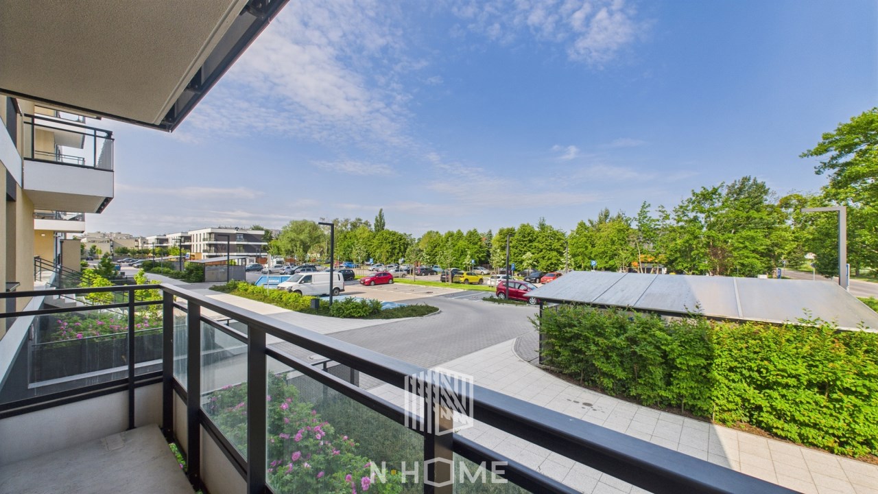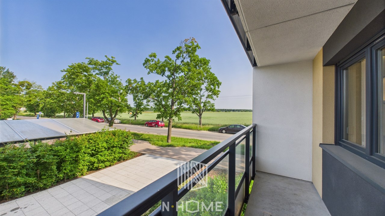 Duży balkon z widokiem na zieleń – wystarczająco miejsca na stolik i donice z kwiatami.