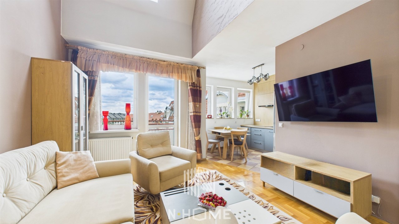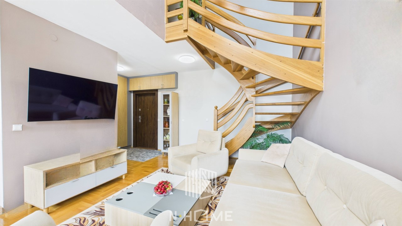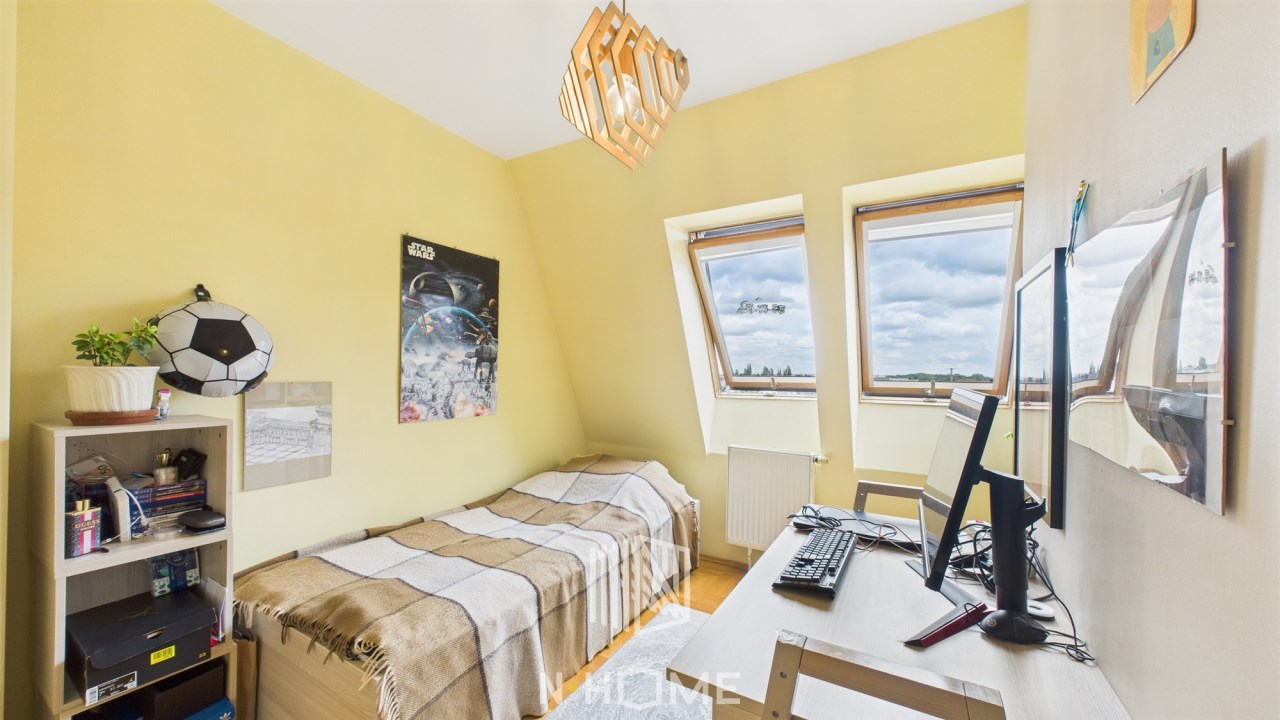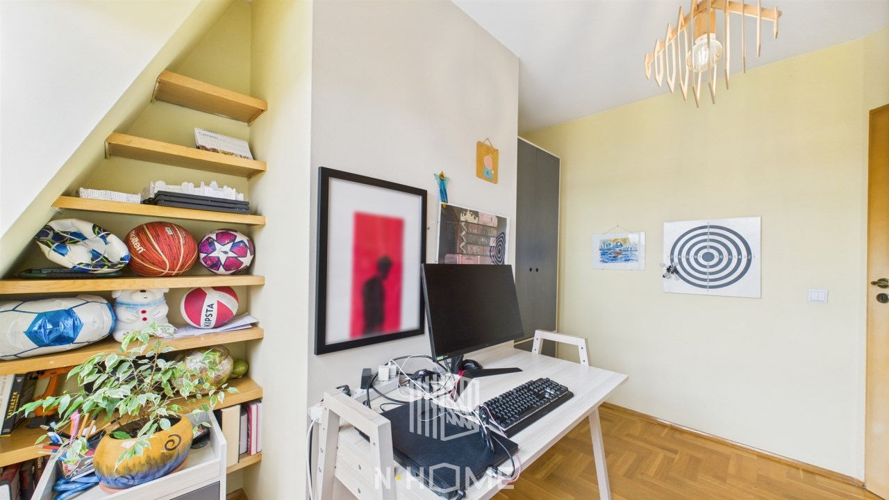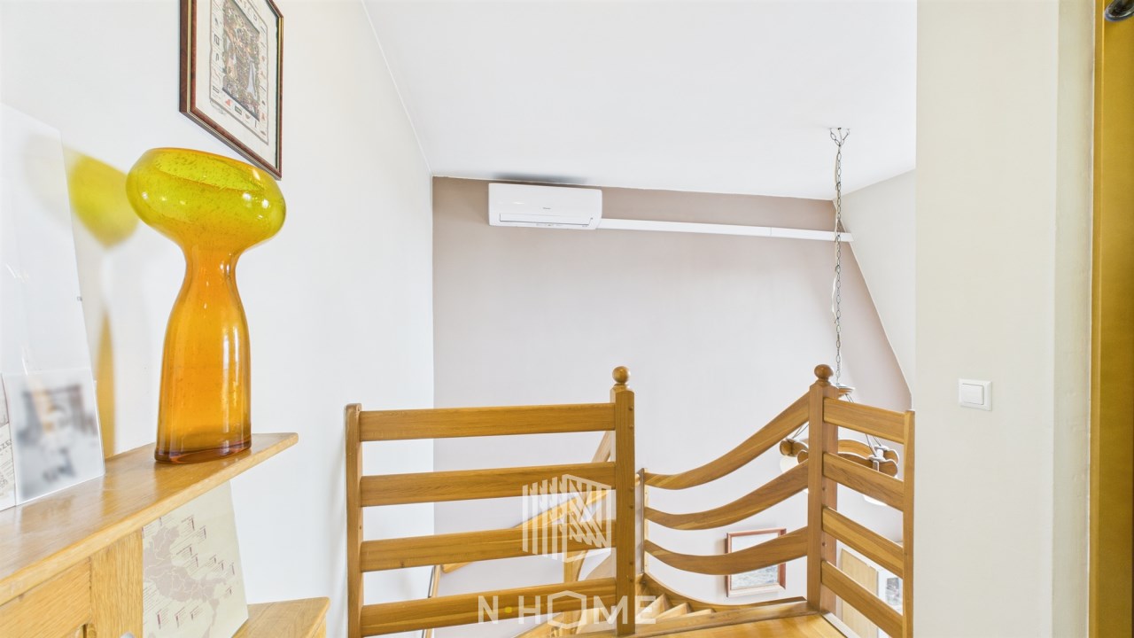 Na dolnym poziomie znajduje się salon z otwartą kuchnią i wyjściem na balkon, dodatkowy pokój (idealny jako gabinet lub pokój gościnny) oraz łazienka z prysznicem i miejscem na pralkę. Na górze mieszczą się dwie sypialnie, w tym jedna z dużą garderobą, oraz przestronna łazienka z narożną wanną. Ściany z cegły zapewniają bardzo dobrą izolację akustyczną i termiczną, a brak sąsiadów z jednej strony oraz ostatnie piętro dodatkowo podnoszą komfort użytkowania.