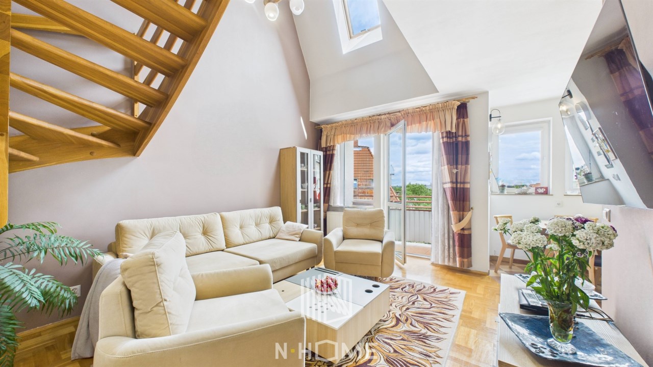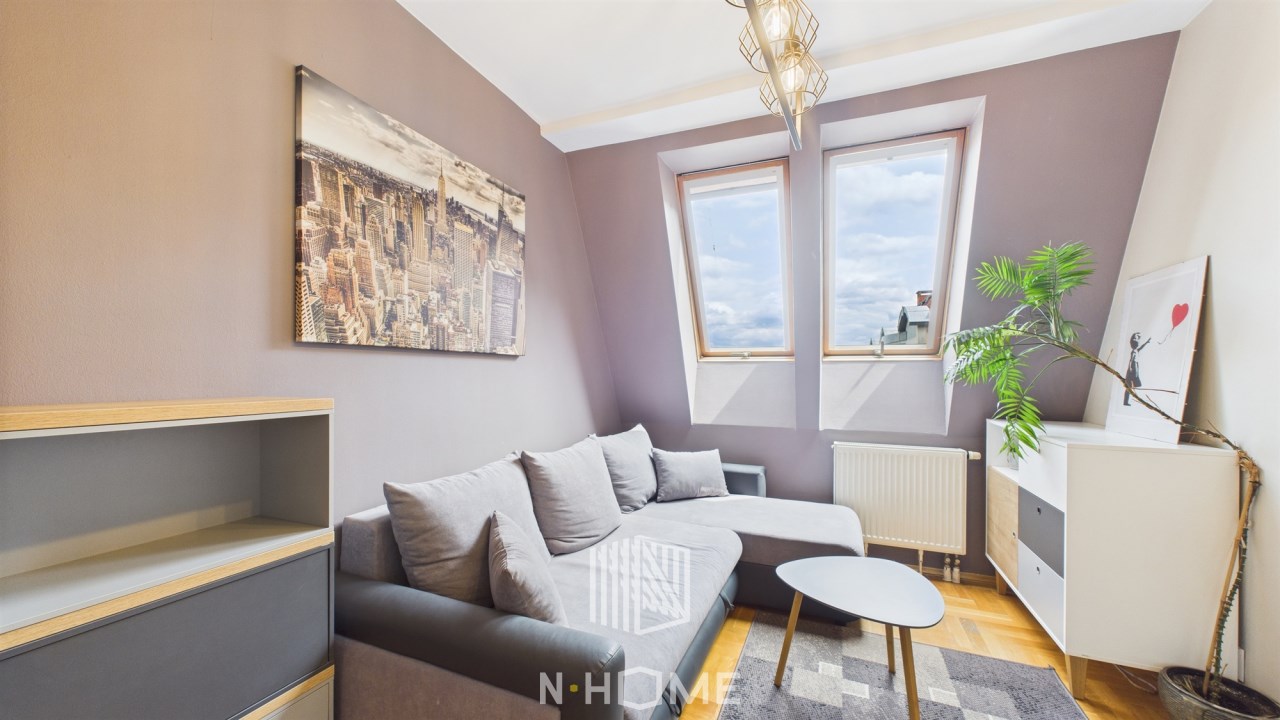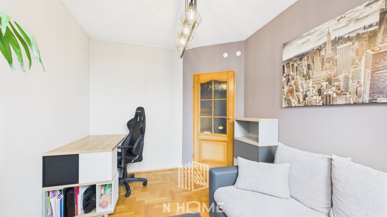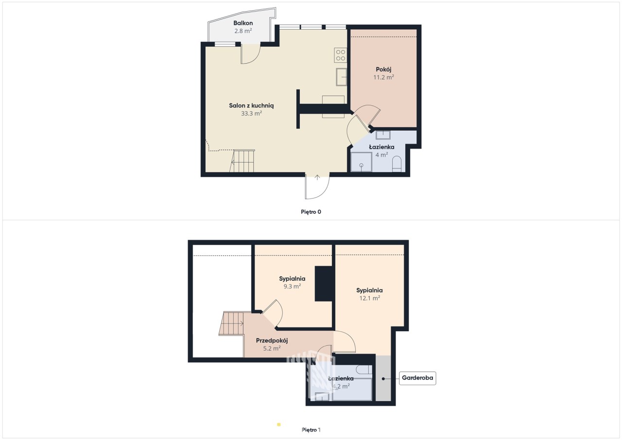 Na dolnym poziomie znajduje się salon z otwartą kuchnią i wyjściem na balkon, dodatkowy pokój (idealny jako gabinet lub pokój gościnny) oraz łazienka z prysznicem i miejscem na pralkę. Na górze mieszczą się dwie sypialnie, w tym jedna z dużą garderobą, oraz przestronna łazienka z narożną wanną. Ściany z cegły zapewniają bardzo dobrą izolację akustyczną i termiczną, a brak sąsiadów z jednej strony oraz ostatnie piętro dodatkowo podnoszą komfort użytkowania.
