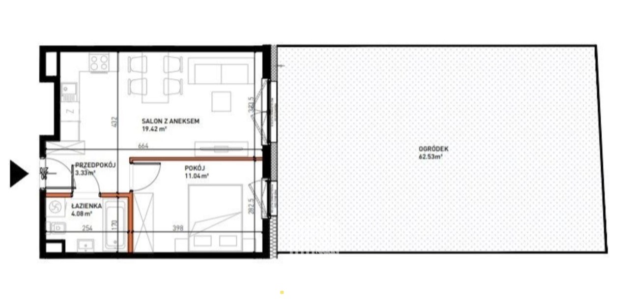 Mieszkanie wyróżnia się prywatnym ogródkiem o powierzchni 62,53 m², który zapewnia komfort, spokój i dodatkową przestrzeń do wypoczynku — rzadko spotykaną w tej części miasta.