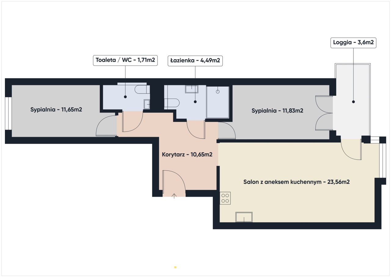 Dwie sypialnie – 11,83 m² i 11,65 m² – idealne dla dzieci, jako sypialnia i/lub gabinet